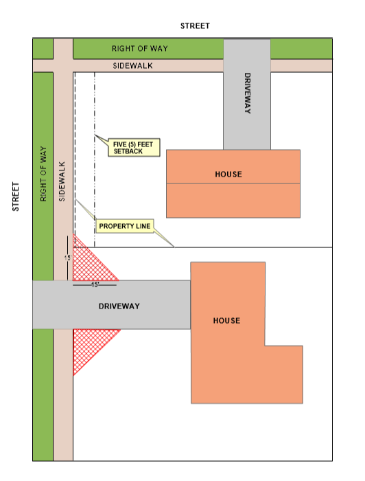 Fences on lots where the rear yard is adjacent to a driveway located on the adjoining property may install a fence provided the fence shall be located a minimum of five (5) feet from the corner side lot line, and shall not encroach into the sight triangle on either side of a driveway, each leg of which is a distance of fifteen (15) feet, the triangle is measured from the side of a driveway and from the front lot line, as illustrated below.