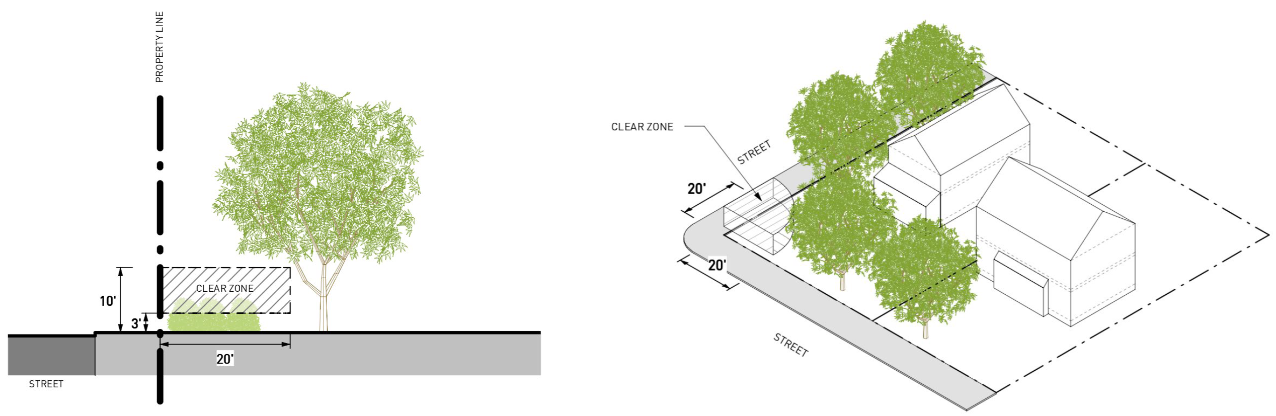 On corner lots within all zoning districts, no fence, shrubbery, sign or other obstruction to traffic line of sight vision shall exceed a height of 30 inches within the triangular area formed by the intersection of right-of-way lines at two points measured 20 feet along the property line from the intersection. Within said triangle, there shall be no sight obscuring wall, fence or foliage higher than 30 inches above grade or in the case of trees, foliage lower than ten feet. Vertical measurement shall be made at the top of the curb on the street or alley adjacent to the nearest side of the triangle or if no curb exists, from the edge of the nearest traveled way.