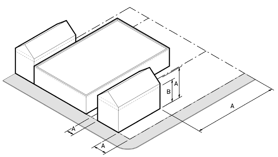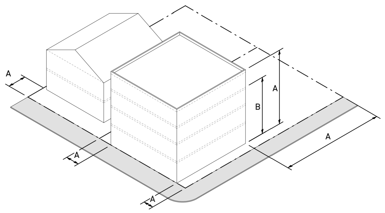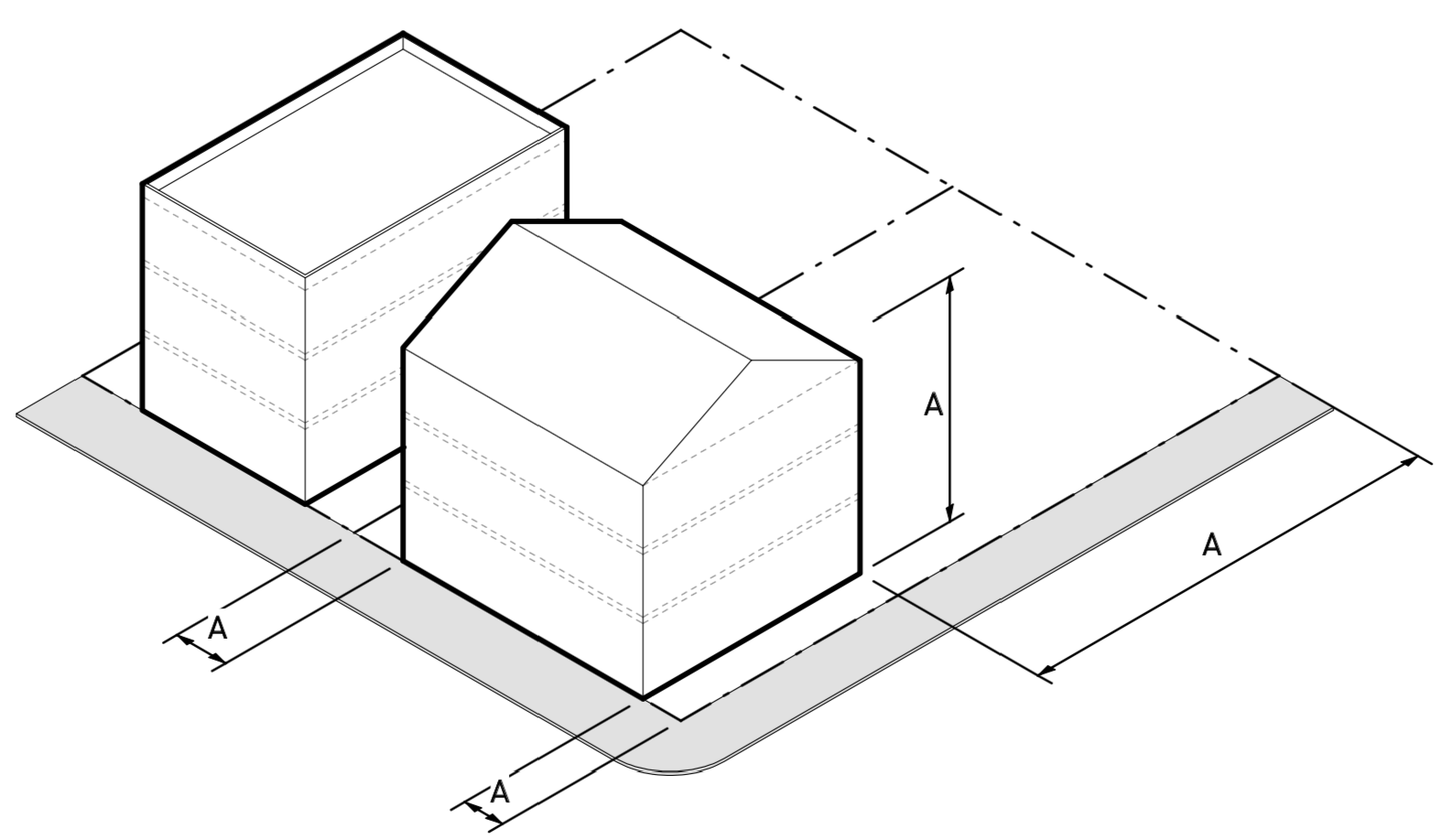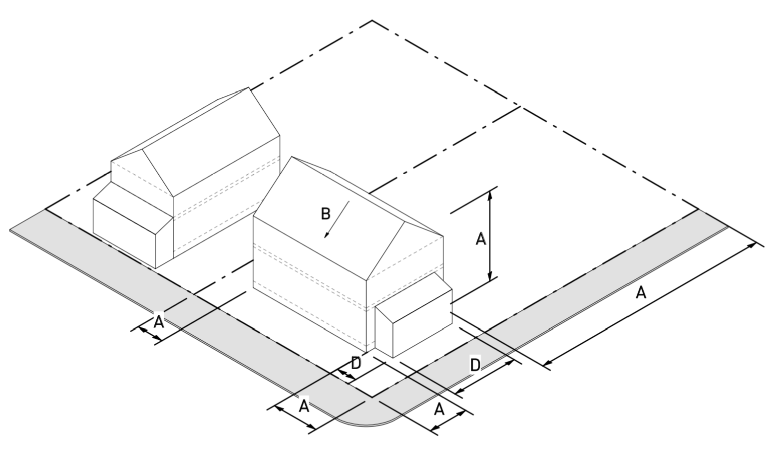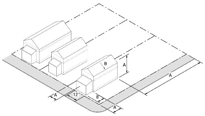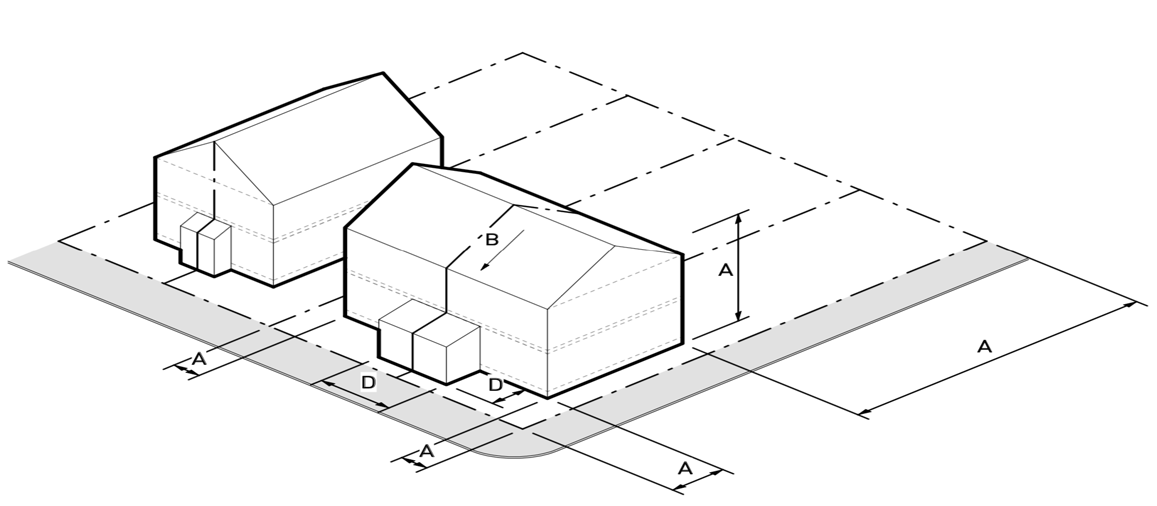 The illustrative drawings provided in this article do not represent required architectural elements, styles, or regulations and are intended to be informational only. Each building typology includes an illustration and additional building design regulations provided in charts for each building type. Notations provided on the corresponding illustrations in the form of letter designations such as "A" through "D" are further defined in each building typology chart.