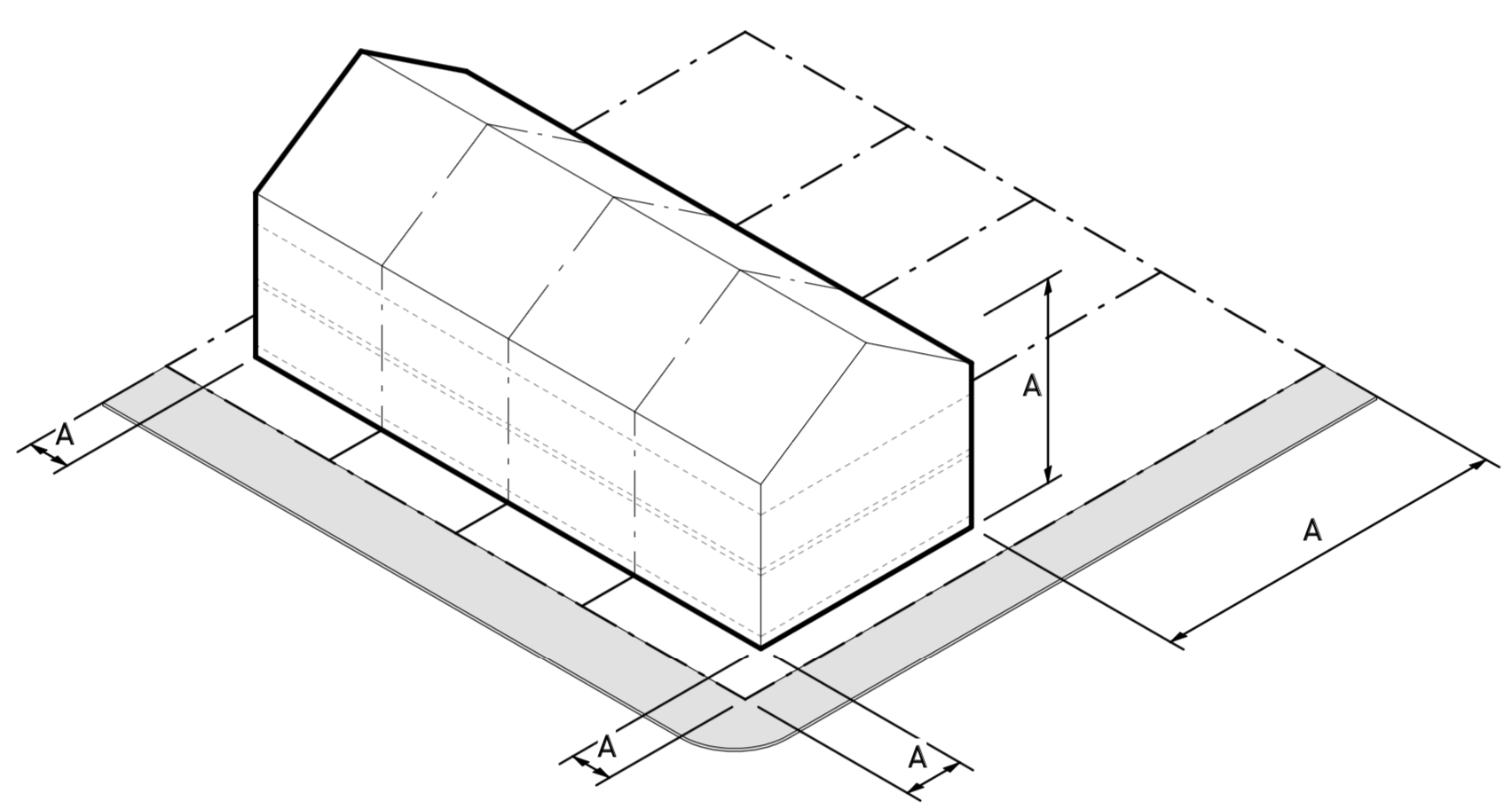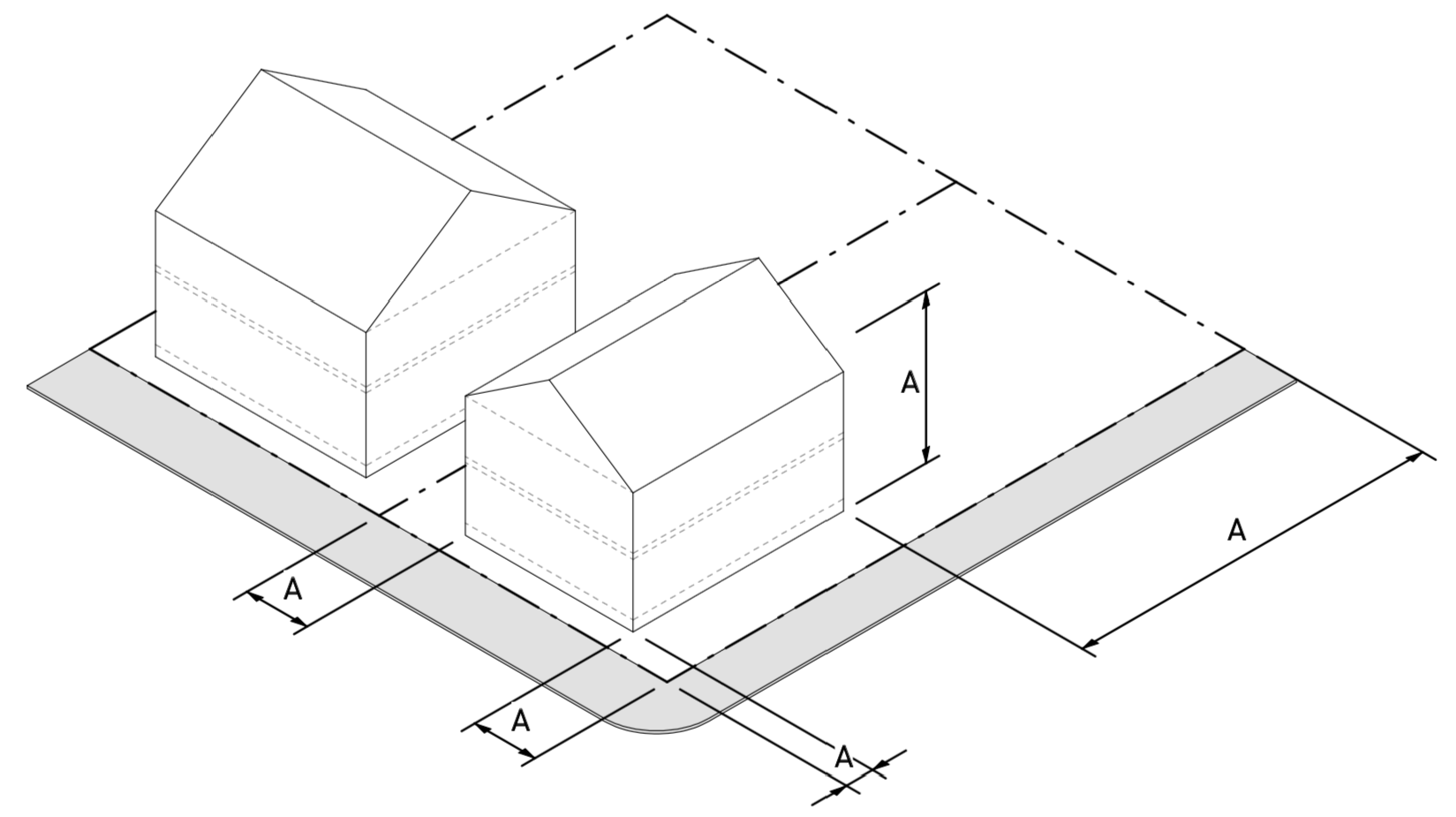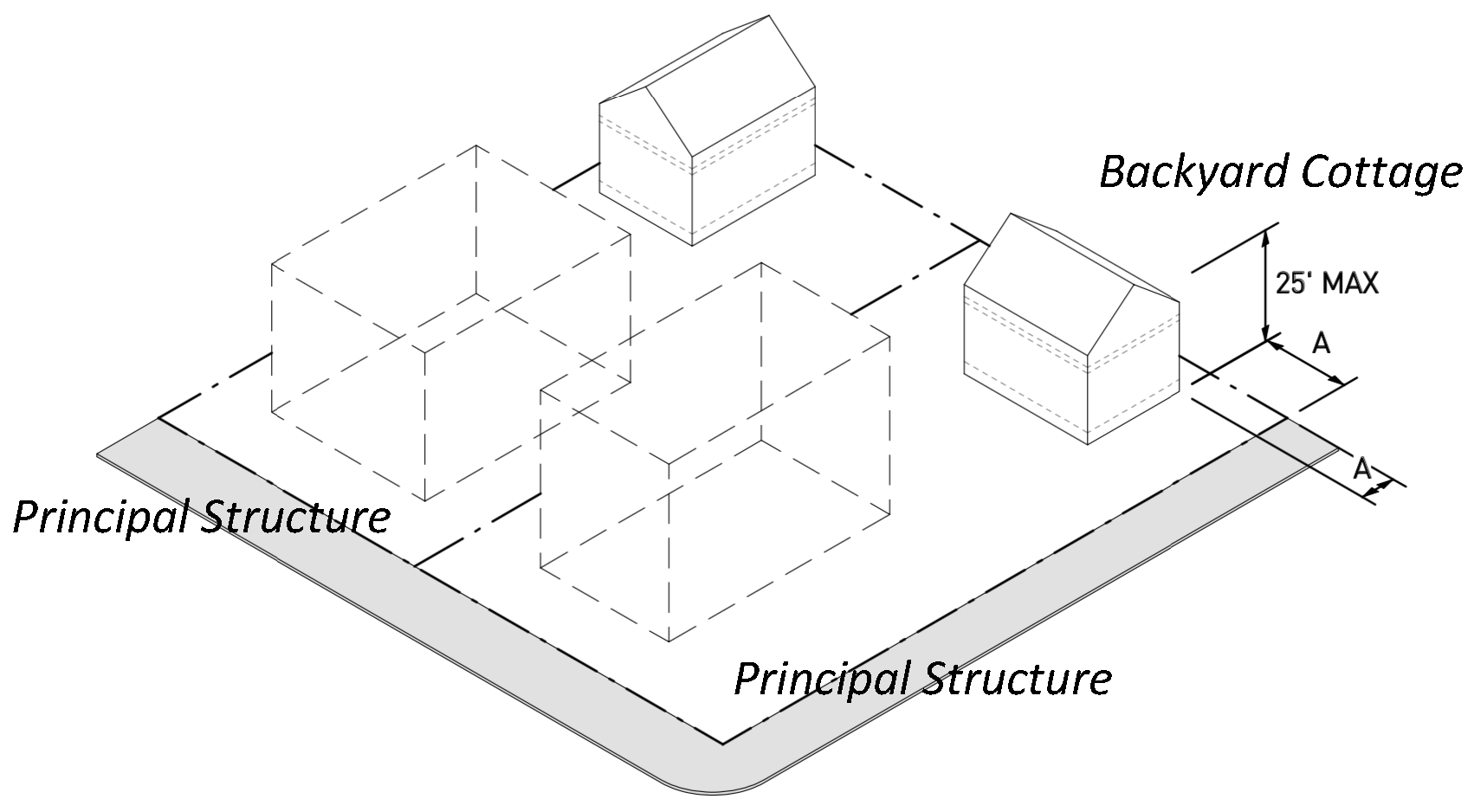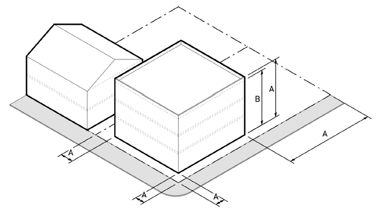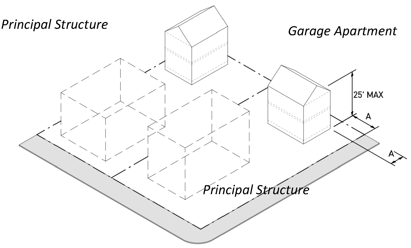 The illustrative drawings provided in this article do not represent required architectural elements, styles, or regulations and are intended to be informational only. Each building typology includes an illustration and additional building design regulations provided in charts for each building type. Notations provided on the corresponding illustrations in the form of letter designations such as "A" through "D" are further defined in each building typology chart.