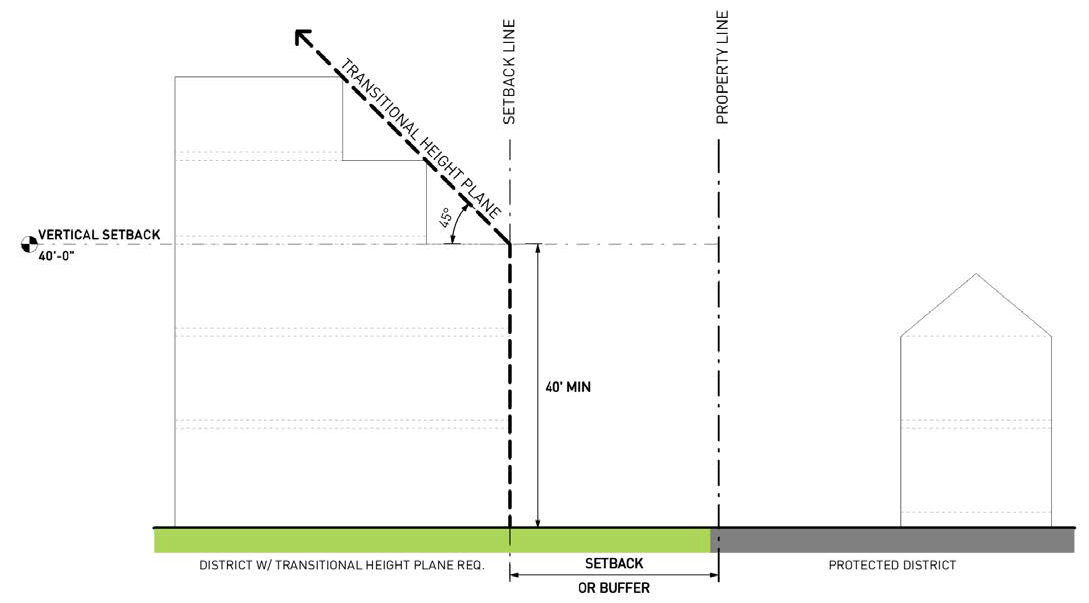 Transitional height planes. A transitional height plane is an imaginary plane having a vertical component and angular component specifically designed to restrict the maximum height of all parts of buildings or structures within CR-MR, CR-MX, DT-MX, G-B, and G-LI zoning districts and their relationship to adjoining ES-R, SU-R, TN-R, TN-MX, and G-RL districts. Transitional height planes shall comply with the following components and regulations: