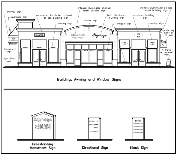 Building sign means a sign mounted, painted, or otherwise attached to a building such as wall signs, projecting/blade signs, hanging signs, awning and canopy signs, multi-story tenant identification signs, marquee signs, and window signs but excluding freestanding signs.