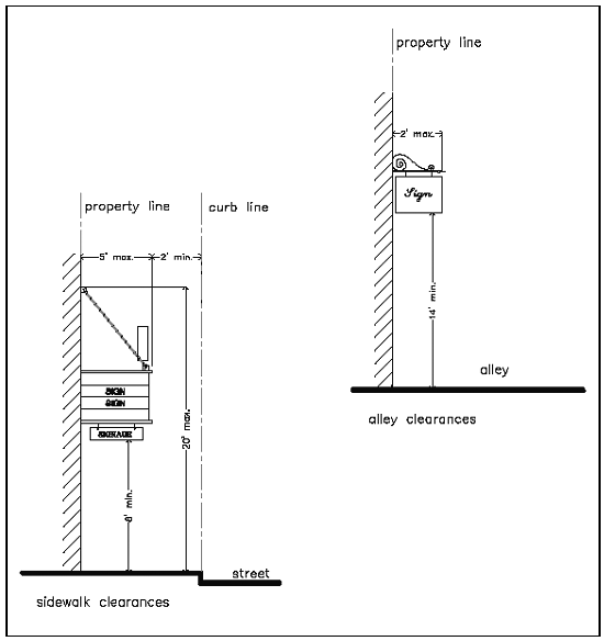 (3) Maximum placement height of blade/projecting signage is 20 feet in the HO, CO, GC, M1, IBP, A, and AS Zoning District. (For North Gateway, see note 4). Note that all projecting signage in all zoning districts must have a minimum clearance of eight feet over walkways or 14 feet over roadways.