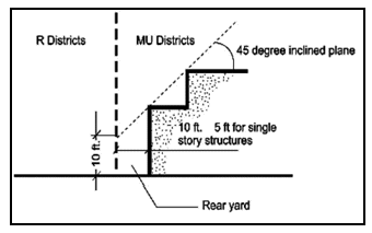 (6) Structures shall not intercept a 45-degree inclined plane inward from a height of ten feet above existing grade at a residential district boundary line. Single story structures and ground level parking may encroach a maximum of five feet into required side and rear yards.