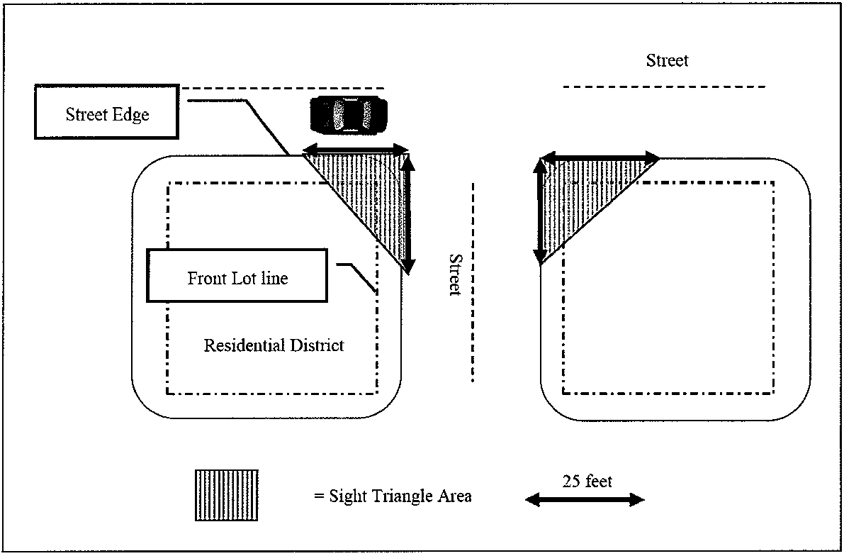 4.6.2.1 Corner lot. A fence, planted hedgerow, or other barrier may be erected on a corner lot following the rules for corner lots established in Section 5.0 Dimensional Controls, provided that no structure or vegetation shall be over three and one-half feet in height within the "sight triangle". The "sight triangle" is defined as the area within an area within a triangle formed by two lines measured along the center of the nearest lane of travelled way of intersecting streets from the point of intersection for a distance of 25 feet, and a third line connecting the terminal points on the two legs measured along the lanes of travel.