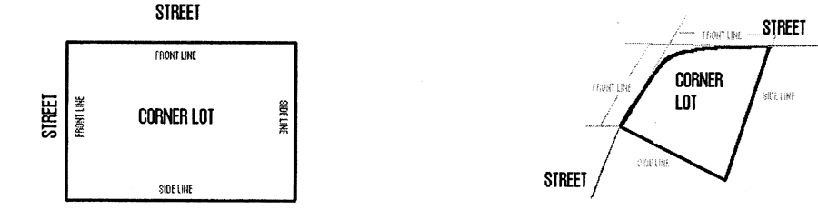 5.1.2 Frontage. Frontage may be measured either at the street line or at the rear line of the required front yard; however, in no case may the sum of these two lines be less than one and eight-tenths times the required frontage dimension. In the case of corner and through lots one street line only shall be accepted as the front street line for the measurement of frontage. On a corner lot, the depth shall be measured from the same street line that is accepted as the front street line for the measurement of frontage.