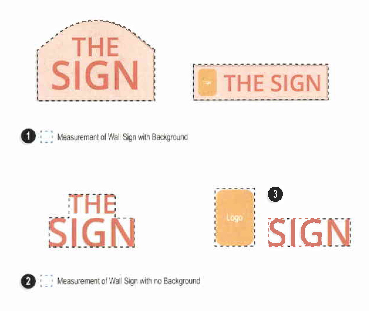 Wall sign with no background. For any wall sign that consists of distinct letters, logos, or other elements placed directly on a structure, the area of the sign shall consist of the smallest simple geometry forming a perimeter around the extreme limits of the sign. Wall signs with no background and formed from distinct letters, logos, and other elements shall be measured using the guide in Figure 44-10-04(a)(1).