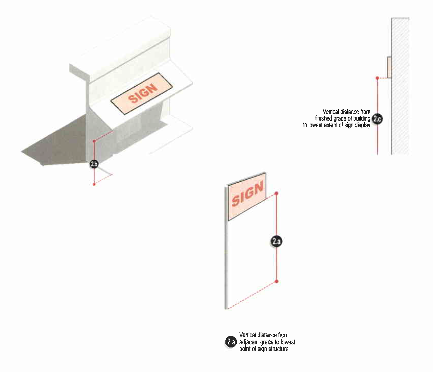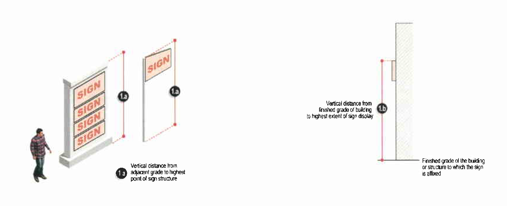 All other signs. The height of any sign not included in subsection 44-10-04(b)(1)a. shall be measured as the vertical distance from the adjacent grade of the building or structure to which the sign is affixed to the highest extent of any lettering, logos, or backgrounds comprising the sign display. Height shall be measured using the guide in Figure 44-10-04(b)(1).