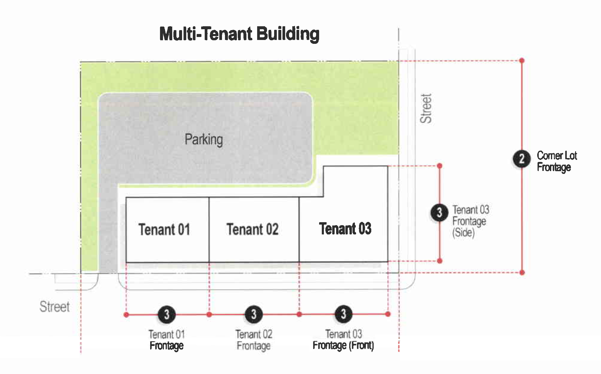 Tenant frontage. Tenant frontage is to be measured as the maximum horizontal extent of the floor plan of a single tenant on the facade or building side on which the tenant entrance is located. In single-tenant buildings, the tenant frontage shall consist of the frontage of the entire building. In multi-tenant buildings, tenant frontage shall be measured as the maximum width of a tenant space based on approved floor plan drawings.