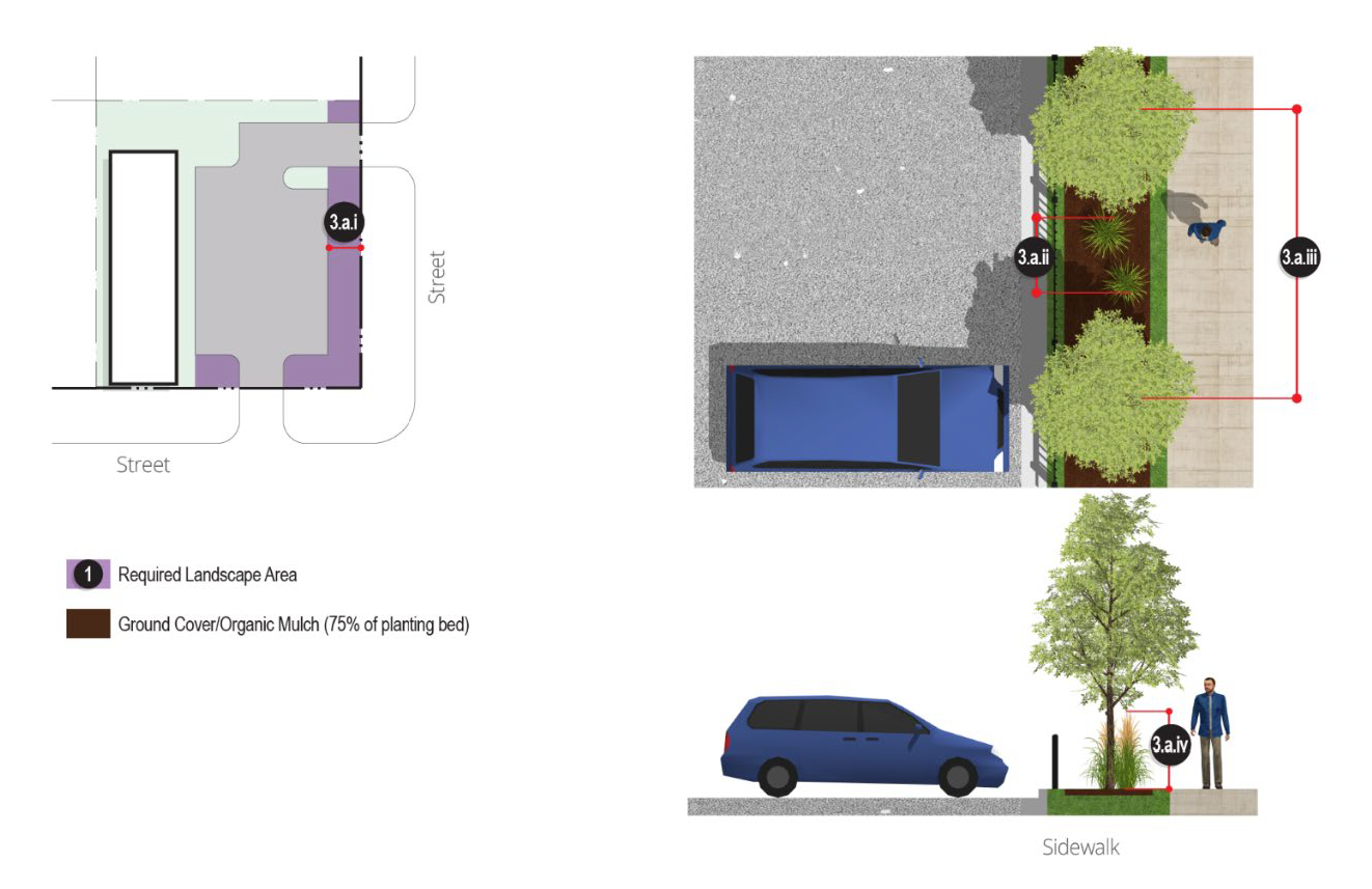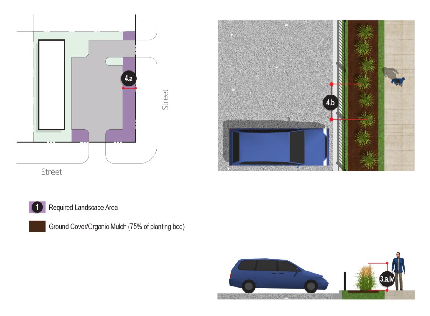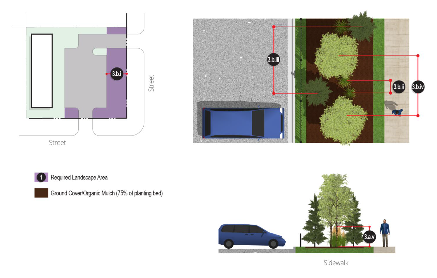 The area between the fence and the property line is landscaped with a combination of shrubs, native grasses, and perennials to cover a minimum 75 percent of the planting bed along the full length of the fence fronting the street.