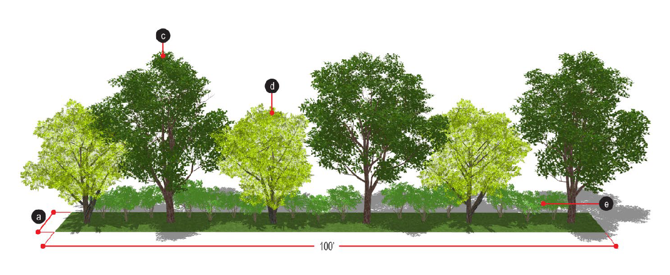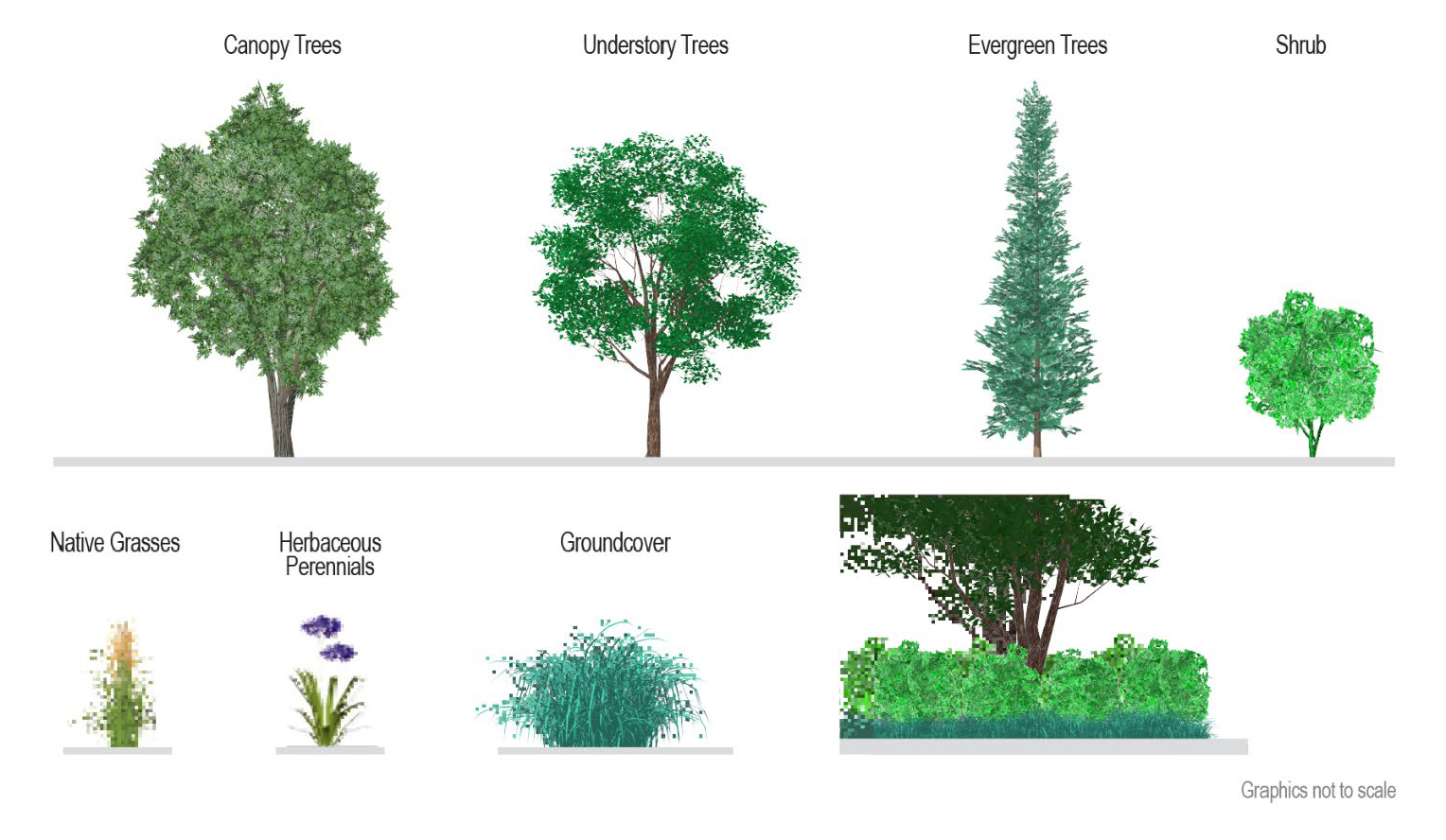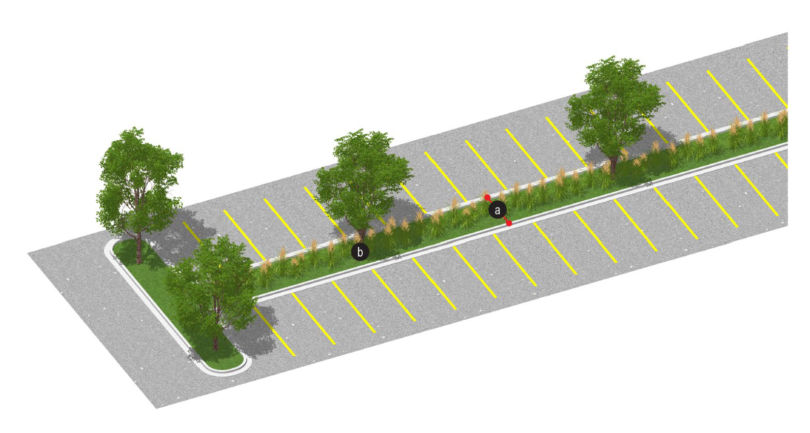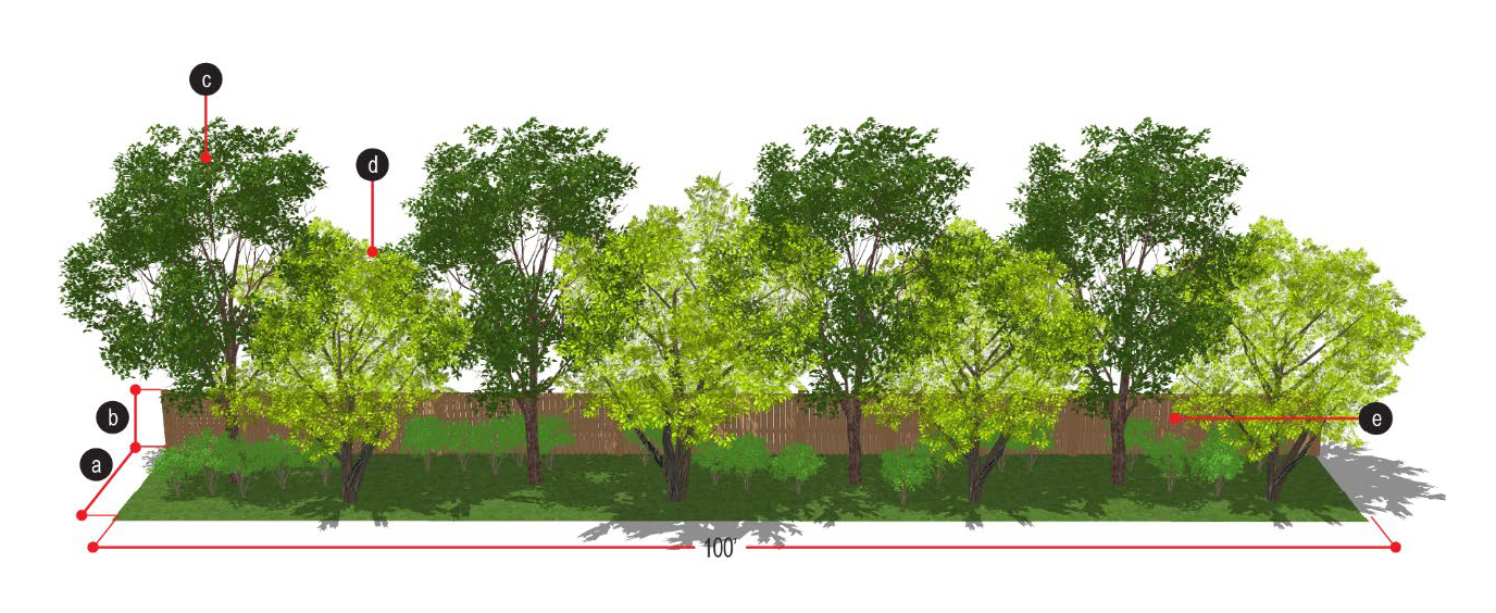 The area between the fence and the property line is landscaped with a combination of shrubs, native grasses, and perennials to cover a minimum 75 percent of the planting bed along the full length of the fence fronting the street.