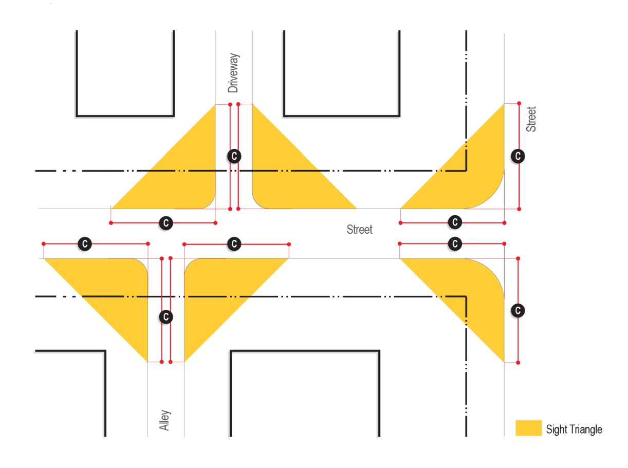The minimum distance at any intersection shall be 15 feet. Greater distances may be required based on the criteria of the American Association of State Highway and Transportation Officials (AASHTO), the Illinois Department of Transportation (IDOT), and the discretion of the village engineer.
