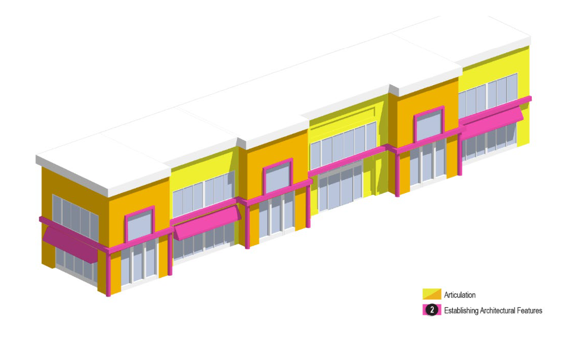 Facade articulation. Facades greater than 60 feet long shall incorporate articulation to avoid large expanses of blank faces and provide visual interest. Articulation may be horizontal, vertical or a combination. Articulation should be applied in a thoughtful and cohesive manner. Elements of articulation may include: