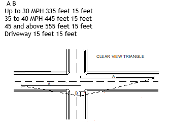 CLEAR VIEW TRIANGLE: A triangle area to provide a clear view of traffic and pedestrians at each intersection, where a stop is required, or driveway shall be free of viewing obstructions. Fencing, structures, plants, trees, or other obstructions over two (2) feet high as measured from the average grade at the property line, are not allowed in the clear view triangle. For dimensions and locations of the clear view triangle refer to the chart below.