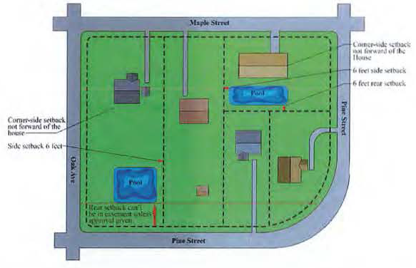 Above-ground and in-ground swimming pools may meet a six (6) feet minimum setback requirement in any zoning district; provided that there is a principal use or structure on the land, and that the pool is not located forward of the principal structure or on a street/corner side. Pool enclosures and decks over twelve (12) inches in height must meet setback requirements of the zoning district.
