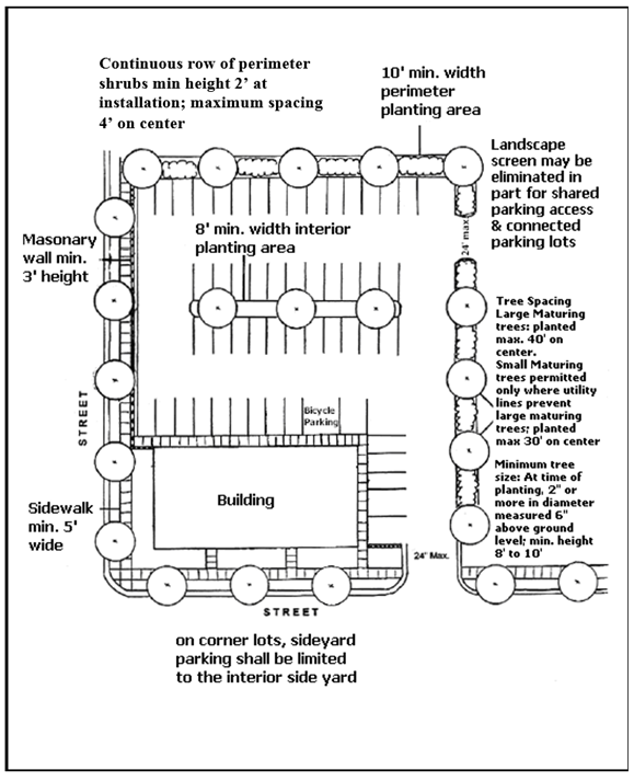 Interior landscaping of parking lots shall consist of large maturing canopy trees placed such that each section of parking (up to 35 spaces per section) is enclosed by trees (or building wall), with a maximum spacing of 40 ft. on center. Tree planting areas within parking lots shall be at least eight feet wide, a minimum of 200 square feet in area, edged with a curb at least six inches in height, and designed to minimize damage to trees by parking or moving vehicles. Only where pre-existing overhead utility lines prevent use of large maturing trees may small maturing trees maximum 30 ft. on center be substituted.
