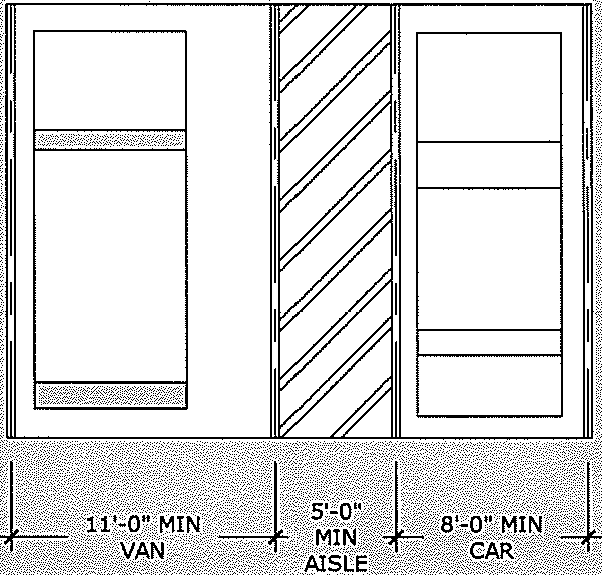 Van parking space width exception. A van parking space may be a minimum of eight feet in width where the adjacent access aisle is also eight feet in width.