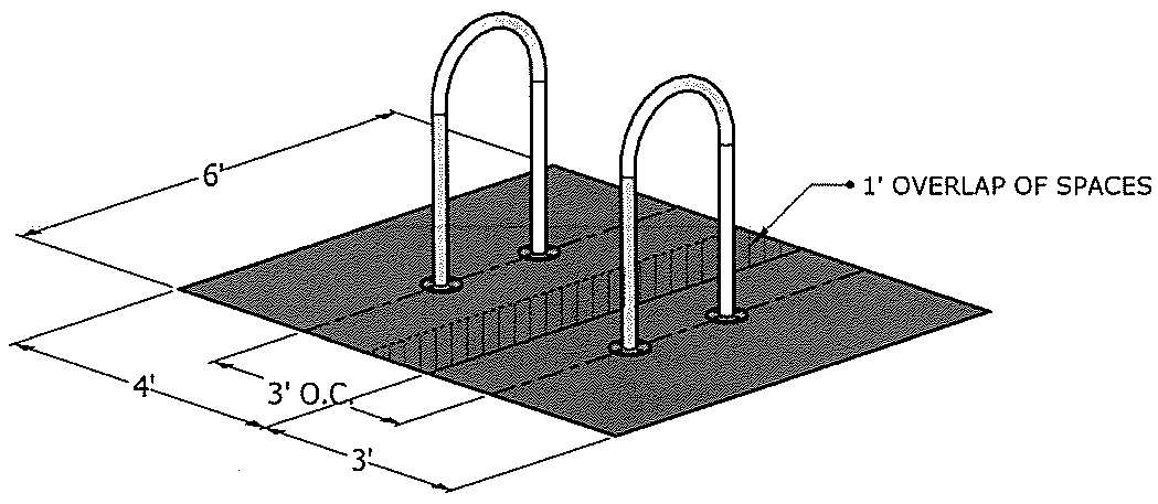 Bicycle parking space shall be a four feet by six feet space provided for locking up to two bicycles to a planner approved bicycle rack or a bicycle locker that can store up to two bicycles per unit. Bike parking spaces may overlap by one foot so that bike racks may be three feet apart. See Figure 1343.D.