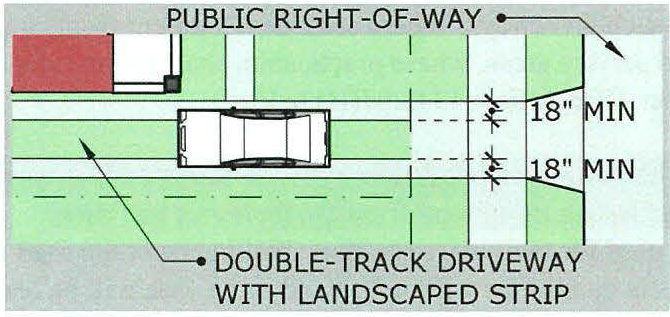 Double-track driveways. Double-track driveways are allowed so long as each wheel strip is at least 18 inches in width and the area between the wheel strips is landscaped with living groundcover. However, within the public right-of-way, the driveway must be fully paved along its total width, from the property line to the curb line, per the requirements of the public works department.
