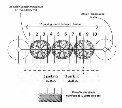 For all parking lots containing six or more spaces, at least five percent of the total parking area shall be landscaped. This landscaping shall be in addition to any other landscaping required pursuant to Chapter 17.51. Trees shall be planted and maintained throughout the parking area at a minimum ratio of one tree per three parking spaces to achieve a fifty (50) percent shade coverage of the parking area within ten years of installation. A landscaped planter of at least eighty (80) square feet shall be provided at least every ten parking spaces. Minimum tree size shall be twenty-five (25) gallon container (or three inches trunk diameter). Landscaping materials and trees shall be selected from a list of approved trees as may be established by the planning department.