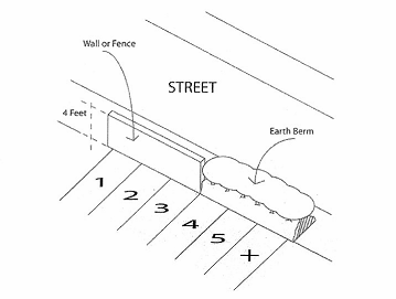 Where a parking facility containing five or more spaces abuts property zoned for residential, the parking facility shall be separated from the abutting property by a solid masonry wall four feet in height, except that portion of the wall which utilizes a four feet high conformation of vegetation and earthen berms.
