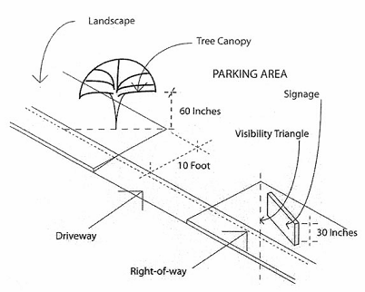 Where parking areas adjoin a public right-of-way, a ten-foot landscaped planting strip shall be established and continuously maintained between the public right-of-way and parking area. Any planting, sign, or other structure within safety sight-distance of a driveway shall not be higher than thirty (30) inches in height or lower than sixty (60) inches (in the case of tree canopies) similar to defined site triangles.