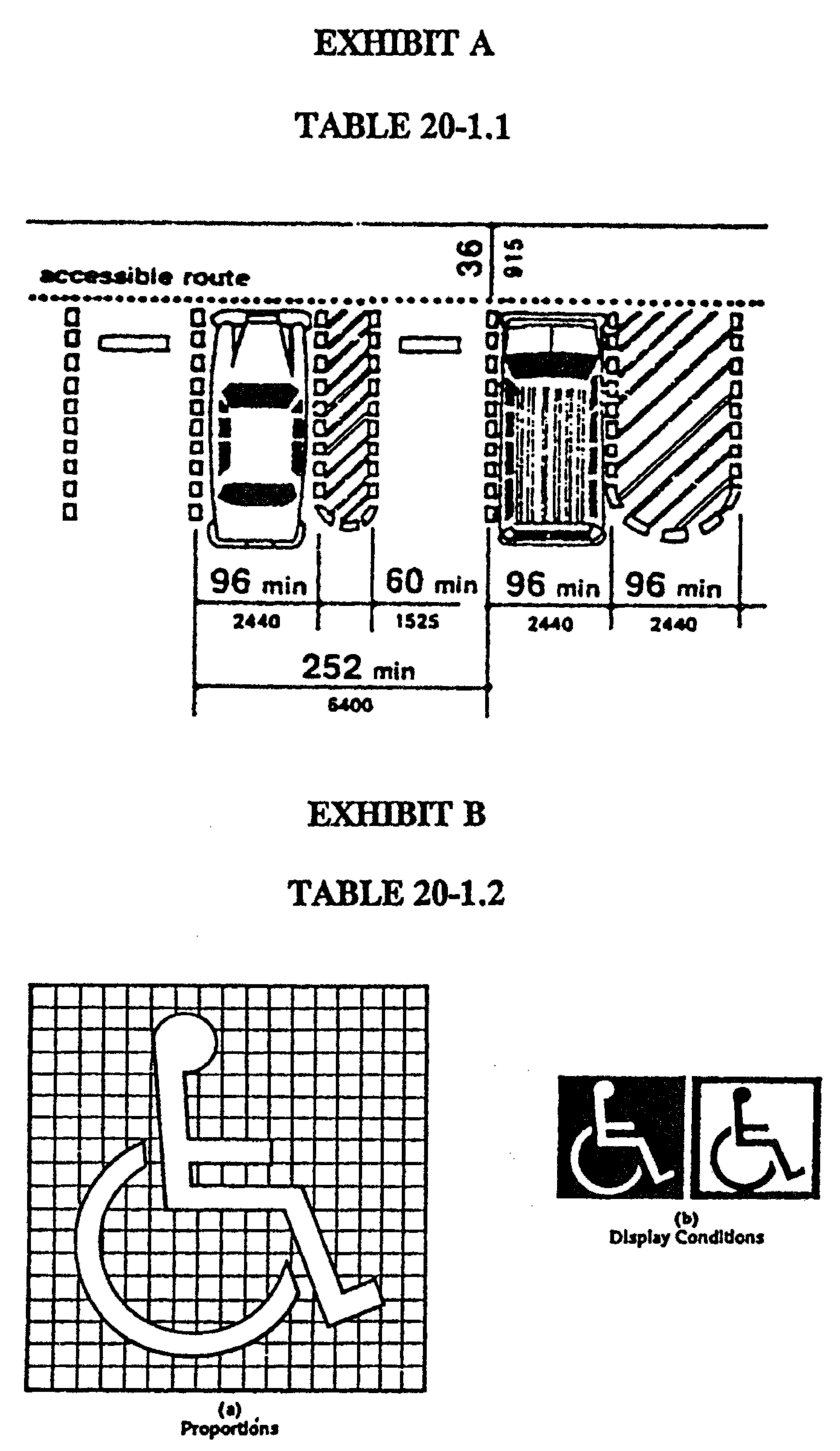 Parking spaces. Parking spaces for disabled people shall be at least ninety-six (96) inches (two thousand four hundred forty (2,440) millimeters) wide and shall have an adjacent access aisle sixty (60) inches (one thousand five hundred twenty-five (1,525) millimeters) wide minimum (see Table 20-1.1). Two (2) accessible parking spaces may share a common access aisle. Parked vehicle overhangs shall not reduce the clear width of an accessible circulation route. Parking spaces and access aisles shall be level with surface slopes not exceeding 1:50 in all directions.