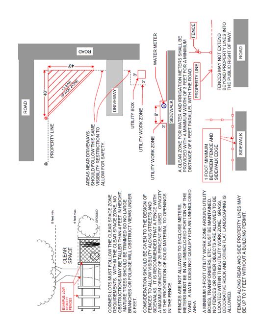 E. Fences and Retaining Walls are further limited as follows: 1. Fences shall be installed one foot (1’) behind the sidewalk or at the property line when a sidewalk is not present. 2. Fences shall be contained within a property boundary. 3. Fence height shall be measured from the lowest surface of the land. 4. Fences installed adjacent to a street shall have the finished side facing the street. 5. Fences shall be constructed according to local building codes and consist of durable industry standard materials include cedar, douglas fir, redwood, or pressure-treated wood products; Vinyl (Polyvinyl chloride); natural boulder, rock or stone; cast in place or precast concrete; wrought iron, welded wire mesh or galvanized chain link. 6. Fences that shall not be permitted include stacked refuse or discarded debris, manufactured wood pallets, chipboard, particle board, or plywood. 7. Where a fence is installed on top of a retaining wall: a. The maximum height of the fence shall be measured from a point half way between the top of the retaining wall and the land on the lower side of the retaining wall. b. The maximum height of the fence shall not be lower than four feet (4’) from the grade on the retained side of the wall. c. The Planning Commission may consider an exemption where the normal use or level of protection requires a greater fence in height for safety purposes. 8. Gates in rear or side yards shall be subject to driveway distance requirements in respect to distances from property lines and road intersections.