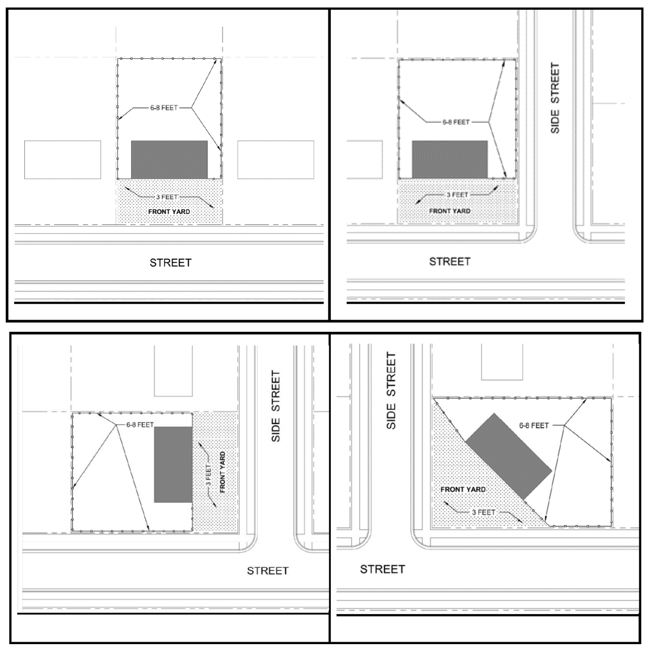 For fencing on through lots, the rear yard fence shall be located no closer to the abutting street than the established building line or the required building setback for that street in the following instances: