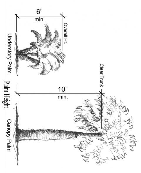 A Canary Island date palm, Sylvester palm, Bismark palm, or palm with a similar quality large "frond canopy" as approved by planning staff with a clear trunk of at least two (2) feet and an overall height of at least twelve (12) feet may count as one (1) canopy tree. Such a palm may count as two (2) canopy trees if it has a clear trunk of at least eight (8) feet and an overall height of at least eighteen (18) feet.