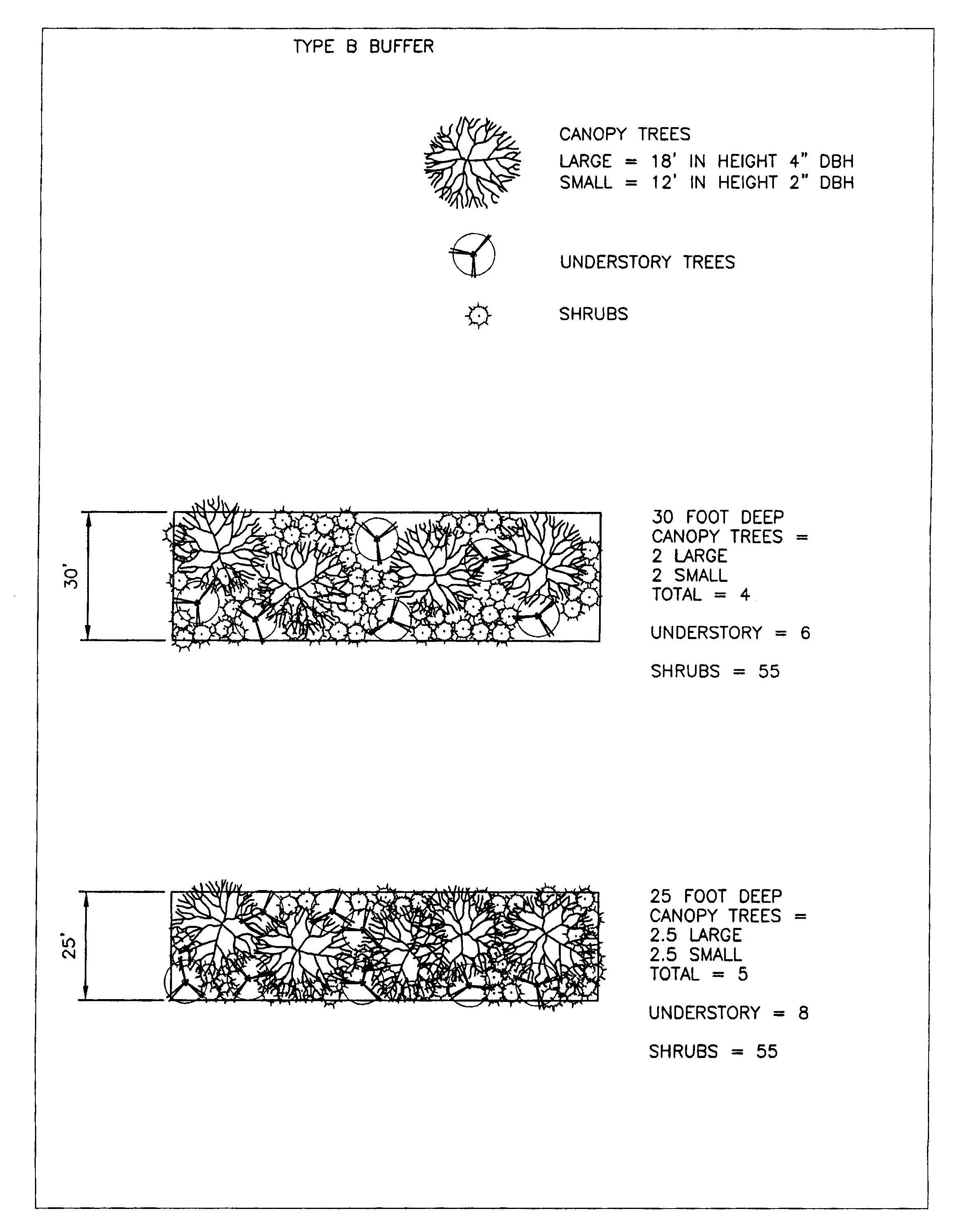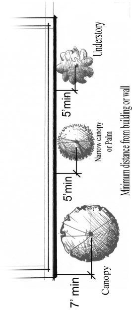 County-acceptable Florida No. 2 1 or better required canopy trees may be used around water bodies and stormwater areas, within park and common green space areas, around and within conservation or preservation areas, and within rear yard and side yard buffers where the buffer depth is greater than or equal to forty (40) feet. In no instance shall a required canopy tree that is less than Florida No. 1 be installed closer than twenty-five (25) feet to the nearest building, driveway, street, or parking area.