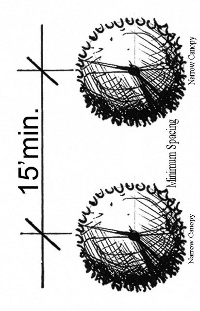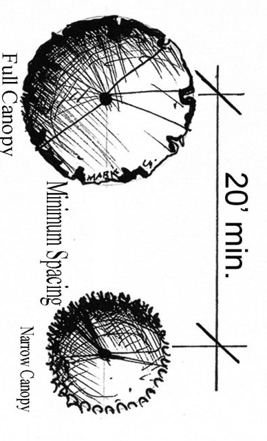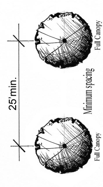 Between full canopy trees (e.g. oak, pine, bay): twenty-five (25) feet.