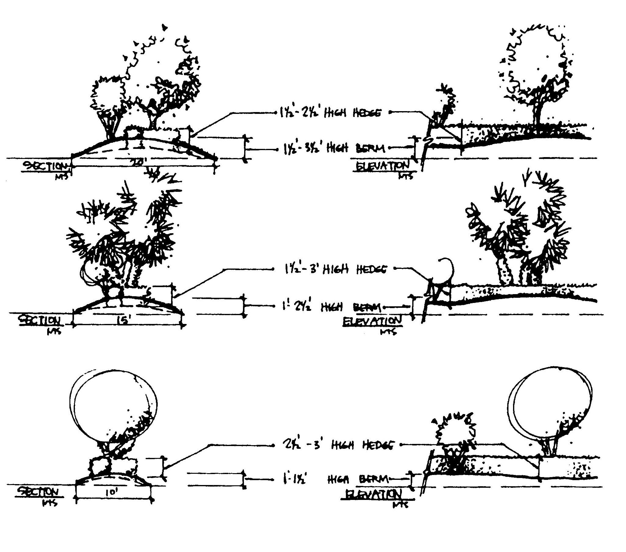 Breaking up the appearance of long sections of wall by the placement of landscaped berms in front of the wall. Unbermed wall sections shall not exceed one hundred (100) feet in length.