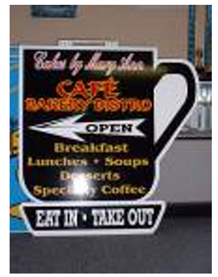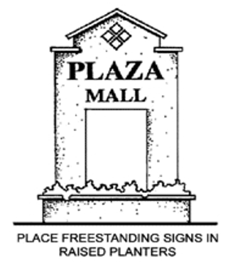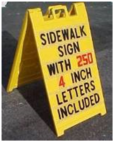 | A-Frame or Sandwich Board | ![]() | 2 feet by 3 feet | 1 per business | 1. Parallel and adjacent to front of storefront or suite where pedestrian sidewalk is less than 7-feet in width. 2. Not within landscaped areas. 3. On sidewalks located directly in front of the business or suite. | Unlimited |