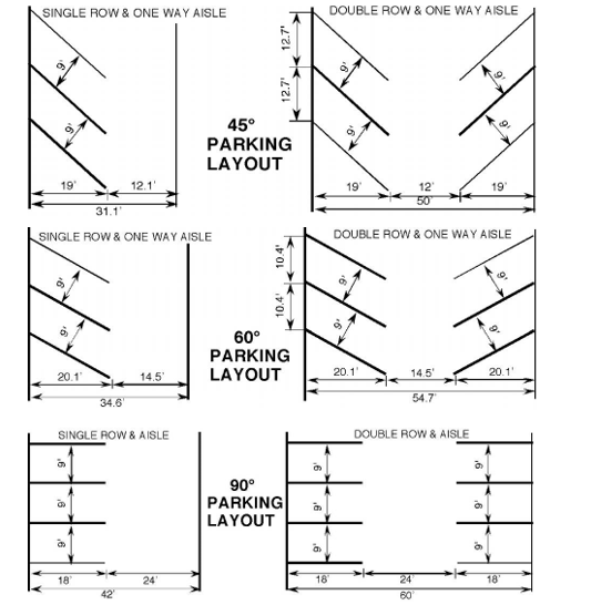 | Parking Angle (degrees) | Stall Width (ft) | Stall to Curb (ft) | Aisle Width (ft) | Curb to Curb Width (ft) |