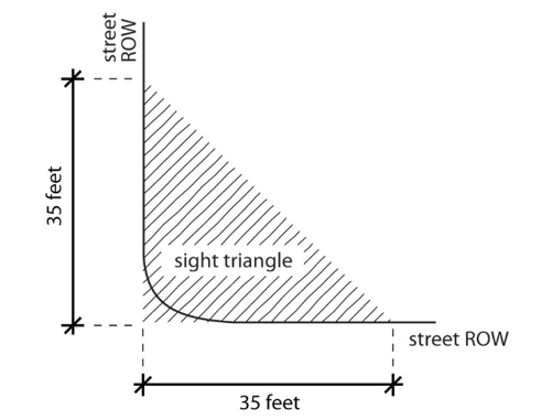 The intersection visibility standards of this article establish triangular areas on corner lots, referred to as “intersection visibility triangles,” within which the placement of buildings, fences, hedges, walls, and other structures is restricted in order to maintain clear lines of sight at street intersections for the purposes of traffic and pedestrian safety.