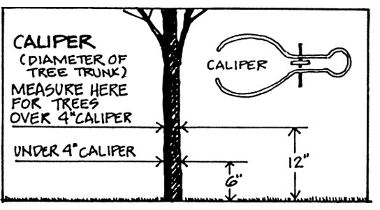 A diameter measurement of the tree trunk taken at 6 inches above ground level for trees up to and including four (4) inches in caliper. For larger trees over four (4) inches in caliper, the measurement shall be taken at 12 inches above ground level.