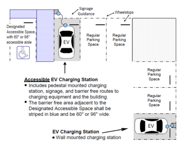 The design of electric vehicle stations shall follow ADA requirements to consider accessibility, ease of use, and safety for drivers with disabilities and vehicle occupants, including those using wheelchairs or other assistive equipment. Refer to Figure 700-3 for a Sample Layout for ADA-Compliant EV Charging Parking Space. Examples of important considerations include the following: