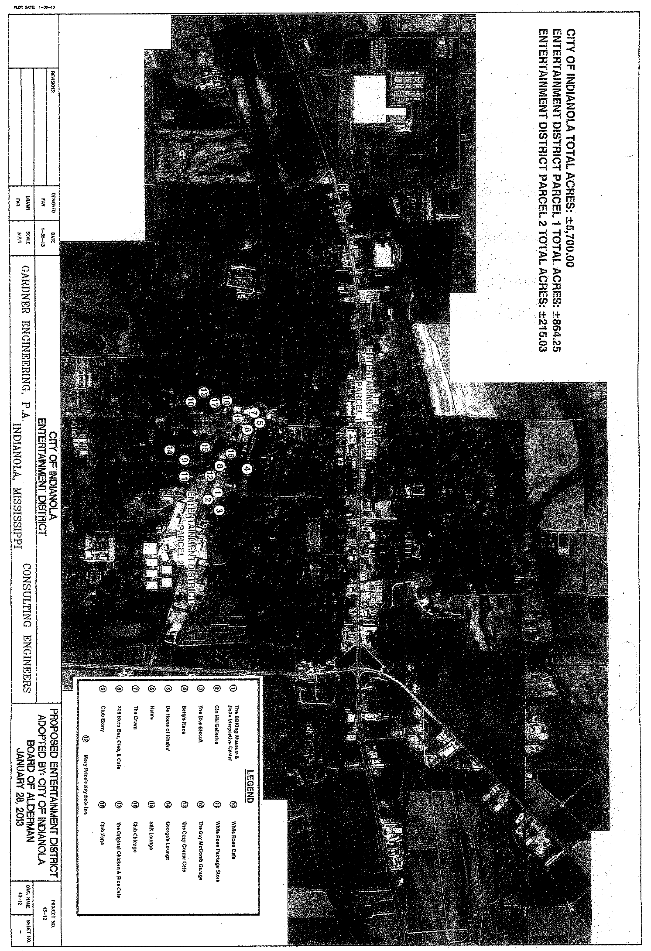 The following described district, a plat and legal description which are herein set out, shall be designated as an Entertainment District of the City of Indianola, Mississippi.