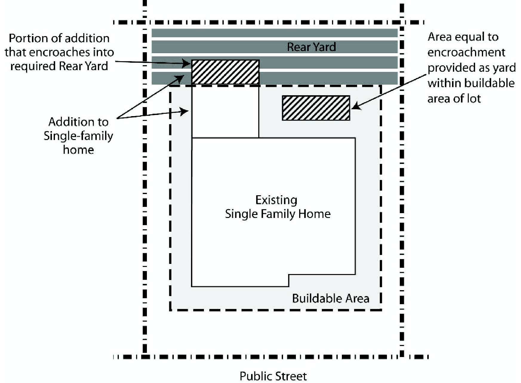 For single-family residential development, a portion of the primary structure may project into the required rear yard area, provided that an equal area of the buildable portion of the lot (this area can be anywhere on the lot) is provided as a yard or court. See Figure 17.32.040-1 (Single-Family Encroachment)