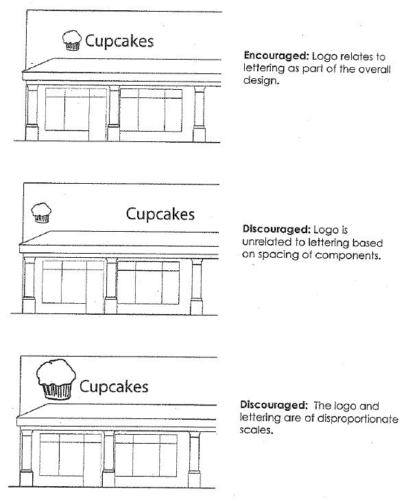 If a tenant's signage on one facade is comprised of multiple elements (e.g., logo and text), the elements shall be located and scaled with relationship to each other. See Figure 17.42.080-3 (Multiple element signs).