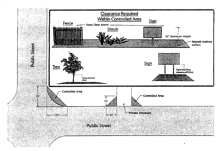 At any corner formed by the intersection of a driveway/alley and street, the cross-visibility area shall be a triangle having two sides ten feet long and running along the driveway/alley edge and curb line of street, said length beginning at their intersection and the third side formed by a line connecting the two ends.