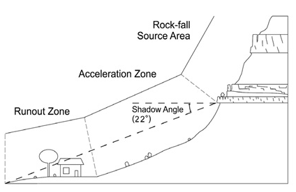 Rock Fall: Rock-fall geologic study areas are not mapped in Iron County at this time, but include locations at the base of rock and talus slopes that are susceptible to rock fall—evidence of past rock falls being the primary indictor. A twenty-two-degree shadow angle, extending from the base of the rock-fall source area, as depicted in the following diagram, shall be used to define the extent of a rock-fall geologic study area. (Note: Shadow angle is dependent on the type of rock involved, and the rock-fall hazard area determined by the geologist may be more or less than that captured by the twenty-two-degree shadow angle used to define the study area. However, twenty-two degrees is relatively conservative, and is deemed sufficient to capture most rock-fall hazard situations.)