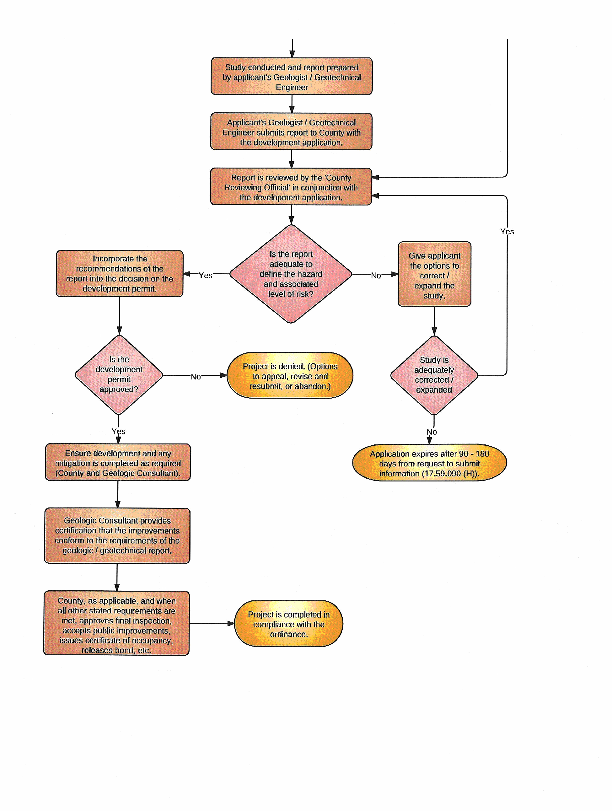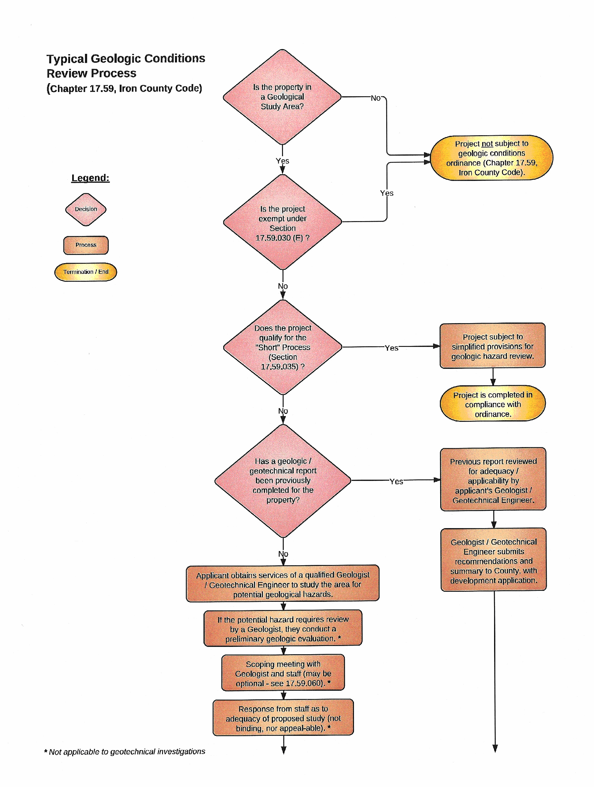 Iron County shall critically review any proposed development that requires preparation and review of a geologic or geotechnical report to determine the possible risks to the safety of persons, property and Iron County infrastructure from geologic hazards. The typical geologic hazard review process is illustrated through the flowchart found in Exhibit A, "Typical Geologic Conditions Review Process."