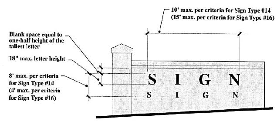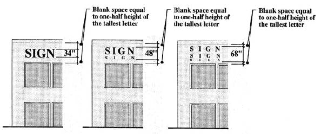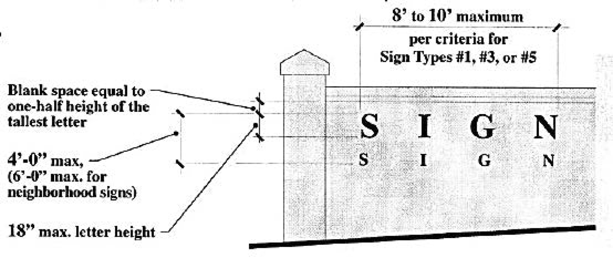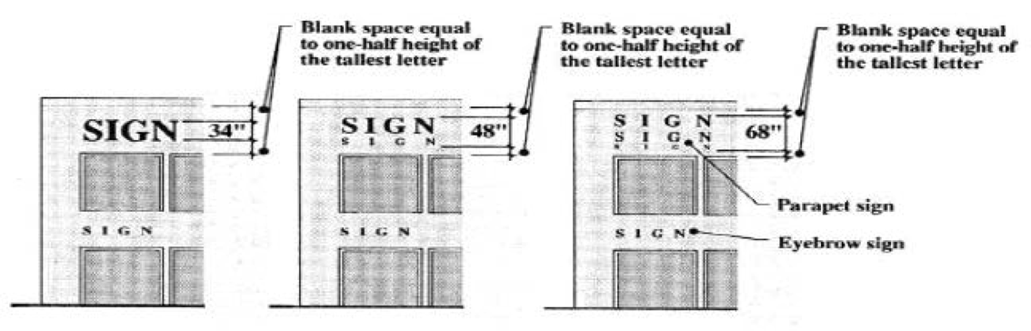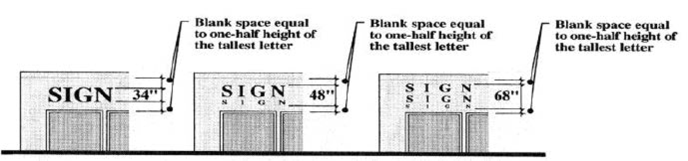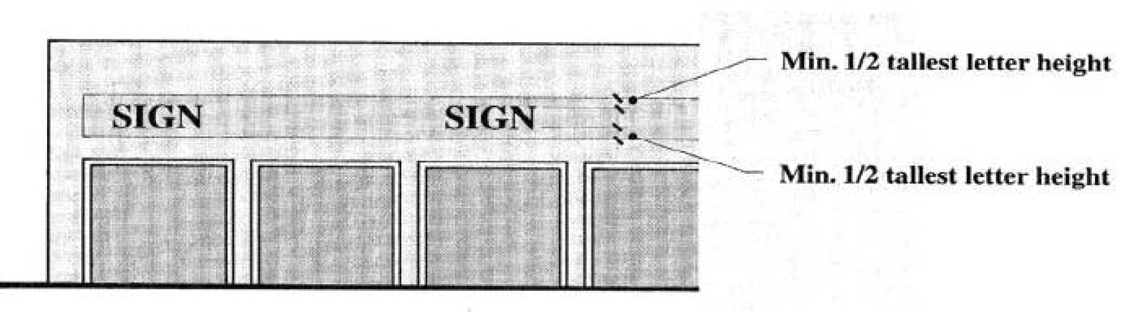 | Blank space around the sign copy equal to one-half the height of the tallest letter must be provided. This space must occur on the same wall surface without interruption by reveals or projections. (Exceptions to the maximum sign height may be granted for registered trademarks, if the average sign height is no greater than the maximum permitted sign height and if the sign is located no closer than one half average letter height to any building edge.) | |