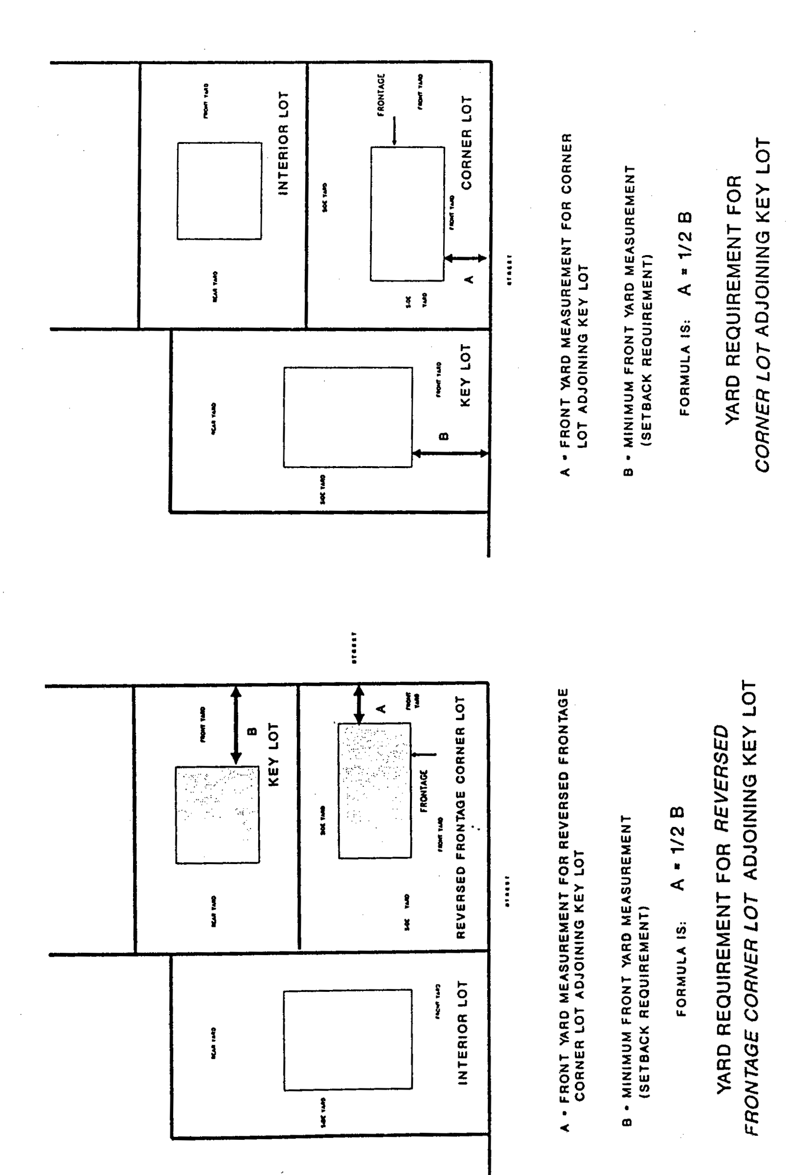 For corner lots which adjoin key lots, the yard setback which is contiguous to a street, but is not the frontage of the structure, shall have a width of not less than one-half (½) the required depth of the front yard setback on the adjoining key lot. (See "yard requirement for corner lot adjoining key lot" diagram following this section.)