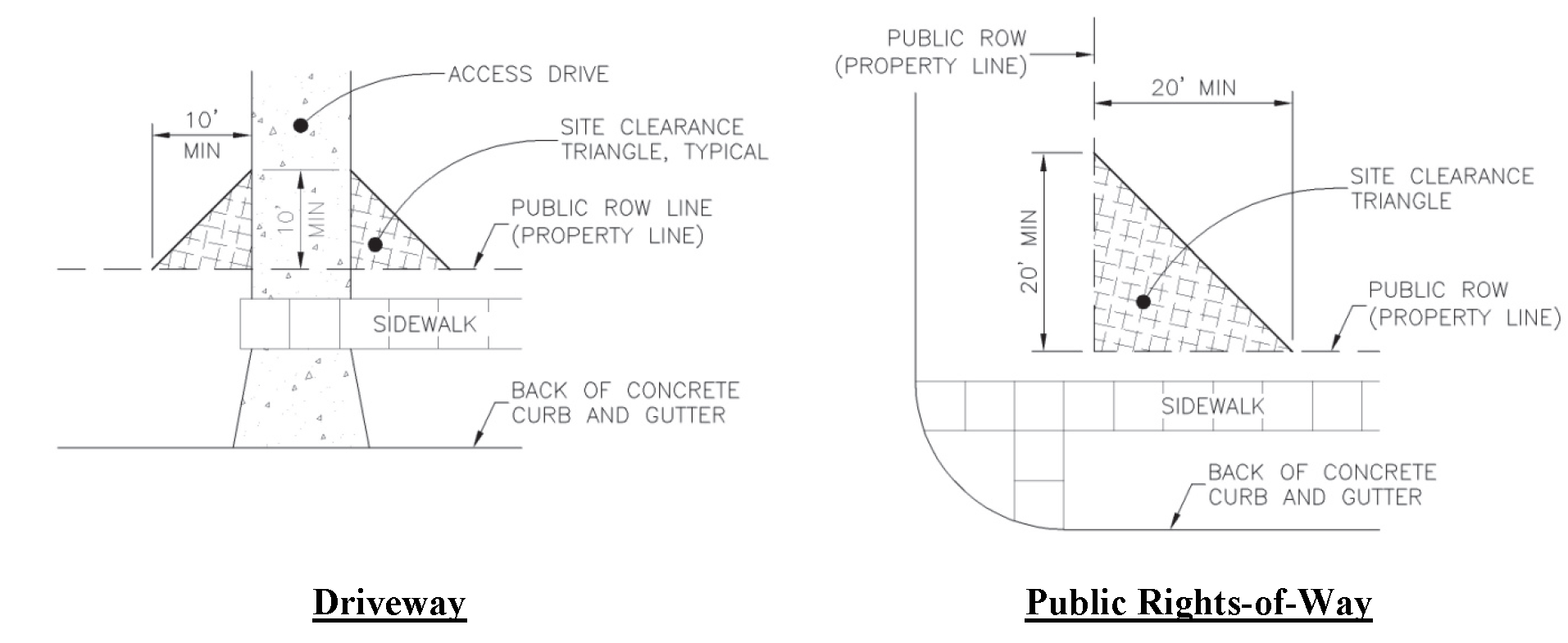 The area formed at the corner intersection of a public right-of-way and a driveway, two (2) sides of the triangle area being ten (10) feet in length measured along the right-of-way line and access drive line and the third side being a line connecting these two (2) sides. For the purpose of plantings located in the lawn extension/terrace, the site clearance triangle extends beyond the right-of-way line to the curb/edge of pavement at an angle perpendicular to both of those lines.