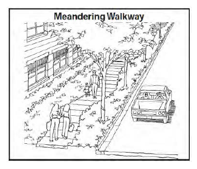 Sidewalks shall be included within the dedicated nonpavement right-of-way of roads and shall parallel the street pavement as much as possible; provided, however, the public development director may permit sidewalks to be designed and constructed so that they meander around permanent obstructions or deviate from a linear pattern for design purposes.