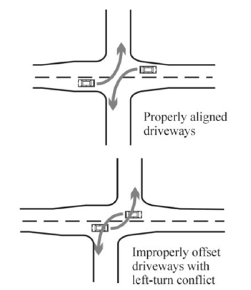 Alignment. Non-single-family residential driveways may be required to be aligned with existing or planned driveways on the opposite side of the road.