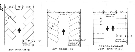 Parking spaces may be permitted with 90-degree, 60-degree, or 45-degree angles to the access aisle. Parking lots with parking space angles less than 45 degrees to the access aisle are not allowed, except for parking spaces that are parallel to the access aisle. Access aisles in parking lots serving parking spaces that are angled shall be limited to one-way traffic. Such access aisles shall be a minimum of 18 feet wide serving spaces that are at a 60-degree angle to the aisle and a minimum of 13 feet wide serving spaces that are at a 45-degree angle to the aisle (see figure).